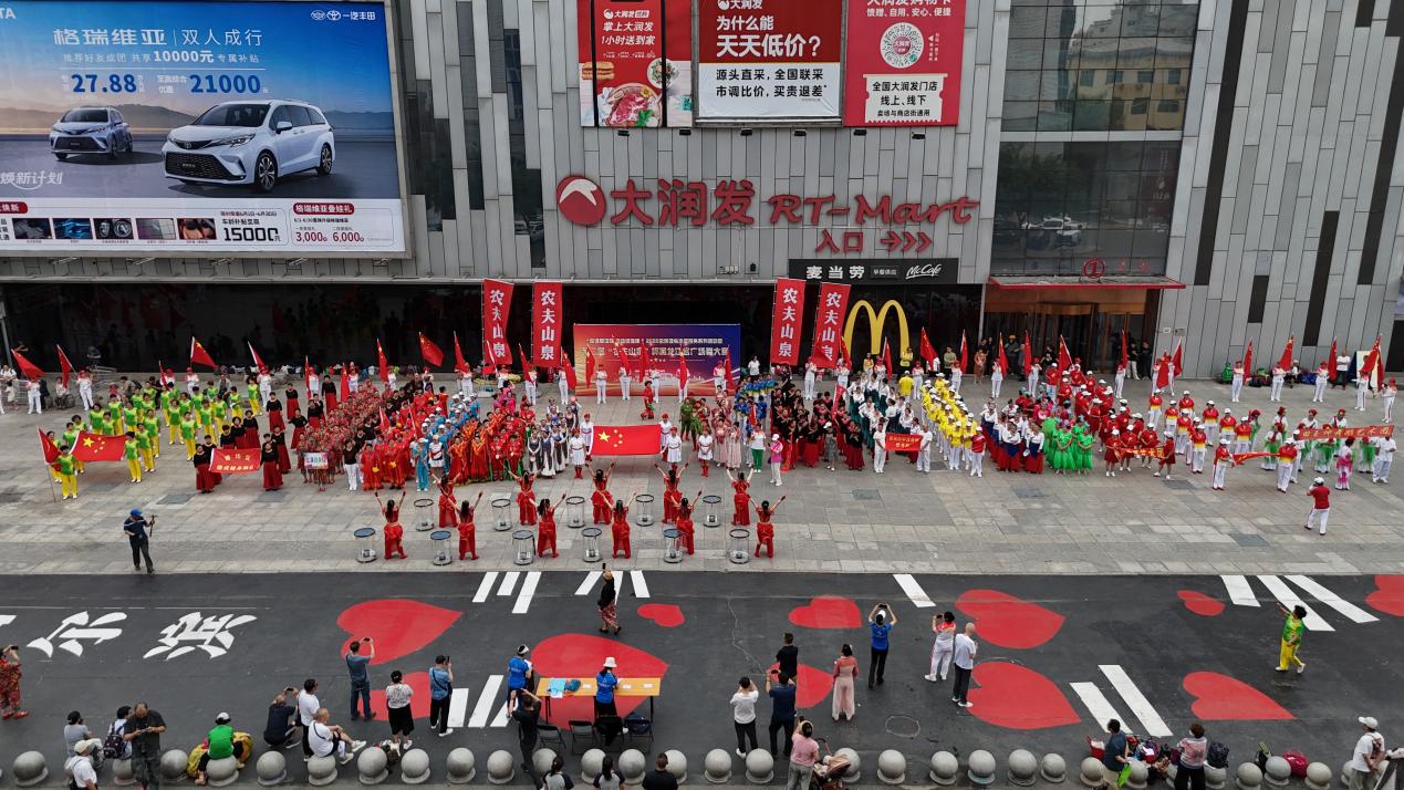 30人鼓樂團(tuán)方陣,精神飽滿閃亮登場,瞬間點燃現(xiàn)場氣氛;隨后身穿紅色T恤的百人舞團(tuán),臺上臺下同跳《丁香花》,優(yōu)美舞姿展現(xiàn)出濃郁地域文化特色……