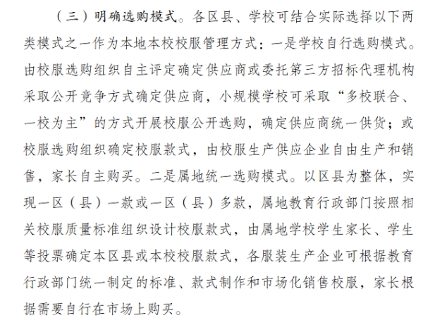 新規(guī)設(shè)計的“自行選購模式”靈活且務(wù)實(shí):規(guī)模較大的學(xué)??勺灾髟u定供應(yīng)商或委托第三方招標(biāo);小規(guī)模學(xué)??刹扇 岸嘈B?lián)合、一校為主”的方式降低采購成本;甚至允許“確定款式后,由企業(yè)市場化生產(chǎn)銷售,家長自主購買”。新規(guī)嚴(yán)禁“定點(diǎn)”“定商標(biāo)”干涉交易,不得設(shè)置不合理入圍條件,確保所有合規(guī)企業(yè)都能公平參與競爭。