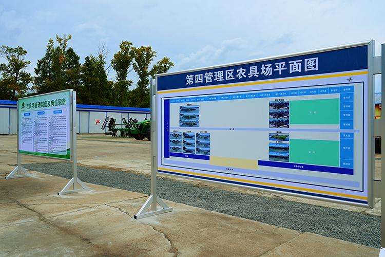 走進(jìn)引龍河農(nóng)場(chǎng)第四管理區(qū)的農(nóng)機(jī)具停放場(chǎng),首先映入眼簾的是《農(nóng)具場(chǎng)擺放平面圖》,不同顏色的線(xiàn)條清晰標(biāo)注著拖拉機(jī)區(qū)、收獲機(jī)區(qū)、農(nóng)具存放區(qū)的位置。