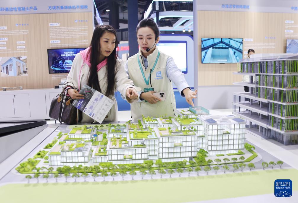 ??11月6日,講解員(右)在住博會(huì)上向觀(guān)眾介紹展出的節(jié)能建筑。新華社記者 潘旭 攝