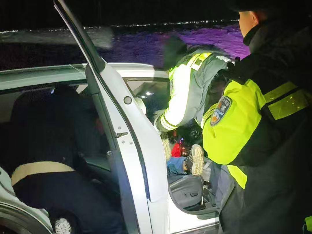 抵達(dá)現(xiàn)場(chǎng)后,民輔警第一時(shí)間查看被困人員狀態(tài),通過簡單詢問,確認(rèn)無人員受傷,隨即立刻展開低溫救援,由于溝坡陡滑,常規(guī)救援設(shè)備無法使用。民輔警毫不猶豫地滑下溝底,并迅速從副駕駛展開救援,經(jīng)過不懈努力,十分鐘后成功將被困人員從車內(nèi)救出。隨后,民輔警主動(dòng)幫助聯(lián)系拖車公司將車輛送至維修廠檢修,并用警車將游客接回派出所安置。抵達(dá)白銀納派出所后,值班輔警遞出早已準(zhǔn)備好的熱水和蛋糕?!皽囟冗_(dá)到零下36℃,手機(jī)凍得即將關(guān)機(jī),還好有人民警察幫忙,不然真的不知道該怎么辦了。”被救助群眾感激的說道。