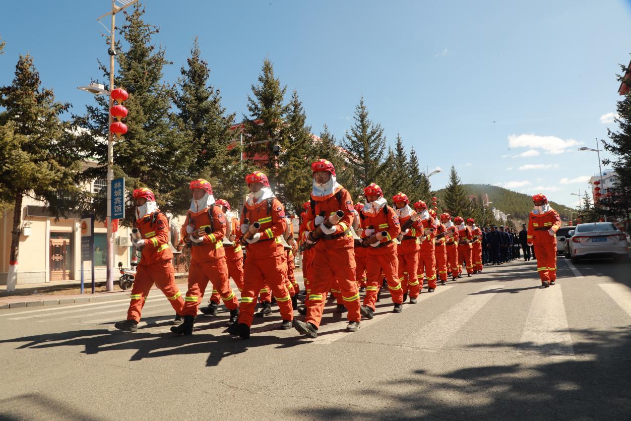 阿木爾林業(yè)局專業(yè)撲火隊員方隊徒步宣傳“五·六”森林火災(zāi)的慘痛教訓,提醒居民身在林區(qū)防火第一(王力 攝)