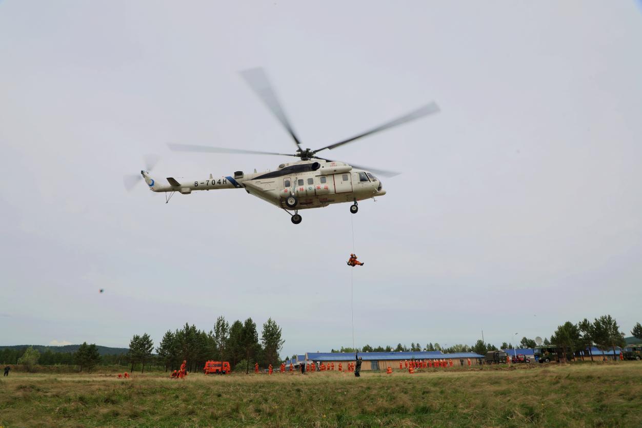 阿木爾林業(yè)局快速出擊小分隊隊員利用森林消防直升機滑降到“火情”指定地點(王力 攝)
