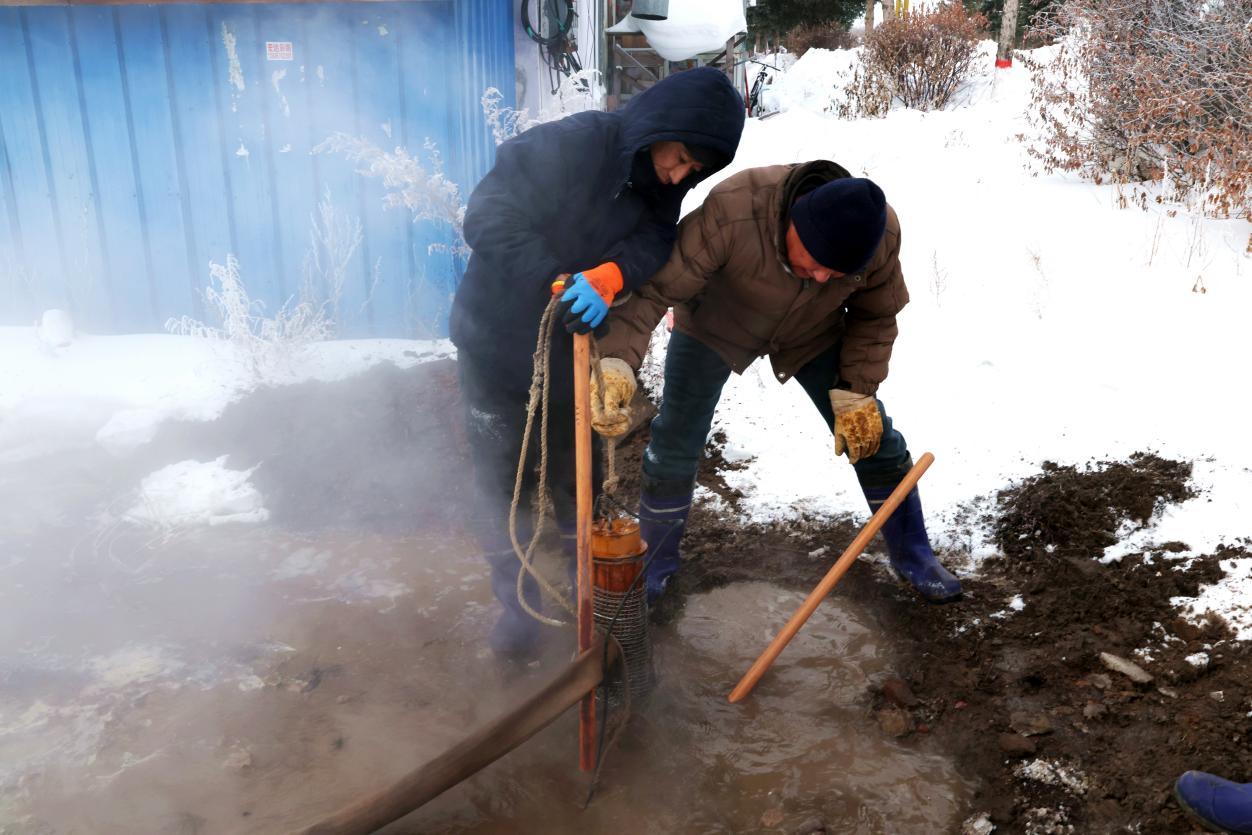 當日早8時許,物業(yè)公司巡線員巡查時發(fā)現(xiàn)西華路平房區(qū)地面冒熱水,立即上報并啟動搶修預案。7名搶修人員火速趕赴現(xiàn)場,現(xiàn)場分工明確、緊張有序,有的安裝水泵排水,有的接駁應急電源,有的揮鎬刨挖凍土層,同時調配小型挖溝機輔助作業(yè)。