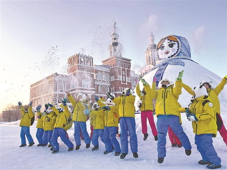 來自四川的研學(xué)團(tuán)隊(duì)在哈爾濱伏爾加莊園揚(yáng)雪嬉戲。