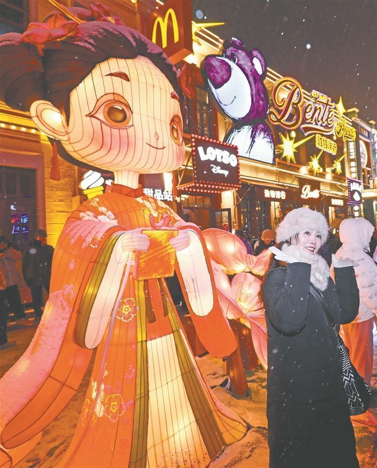 當(dāng)日,鵝毛大雪悄然灑落,覆蓋中央大街、松花江畔、中華巴洛克歷史文化街區(qū)等景區(qū)的各式花燈。紅燈籠覆上薄雪,愈顯艷麗;冰雕彩燈與雪相映,光影夢(mèng)幻,將雪的清冽與燈的暖輝完美融合,整座城市宛如一幅雪景燈畫(huà)。