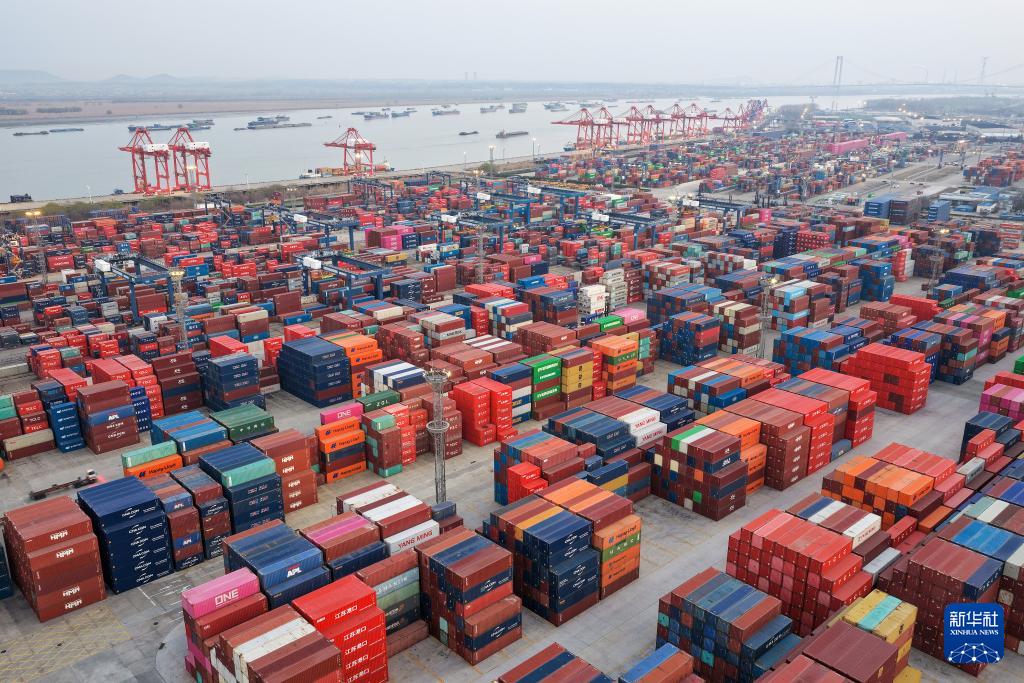 ??3月10日拍攝的江蘇省港口集團(tuán)南京港龍?zhí)都b箱碼頭(無人機(jī)照片)。新華社發(fā)(方東旭攝)