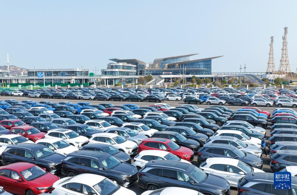 ??3月10日拍攝的江蘇省連云港港出口汽車堆場(無人機(jī)照片)。新華社發(fā)(王健民攝)